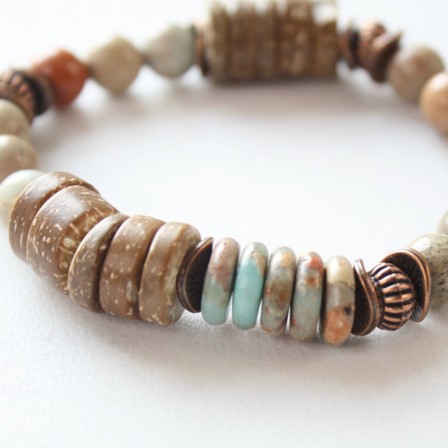Elevate your fashion game with this handmade multi-strand Aqua Terra and wood stretch bracelet – the must-have accessory for those who crave that boho chic flair! This piece isn't just a bracelet; it's a ticket to a world of style, and it's here to bring out the free spirit in you.
