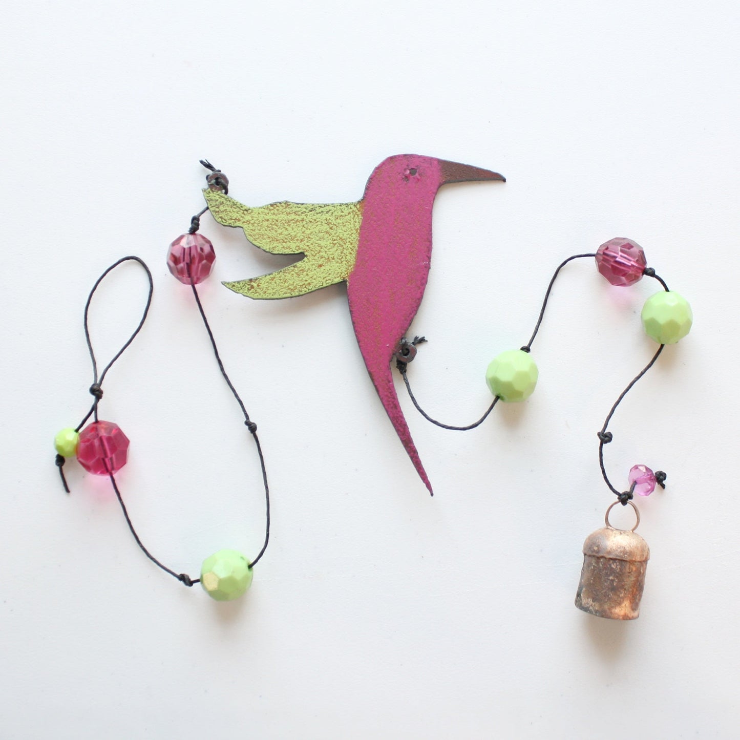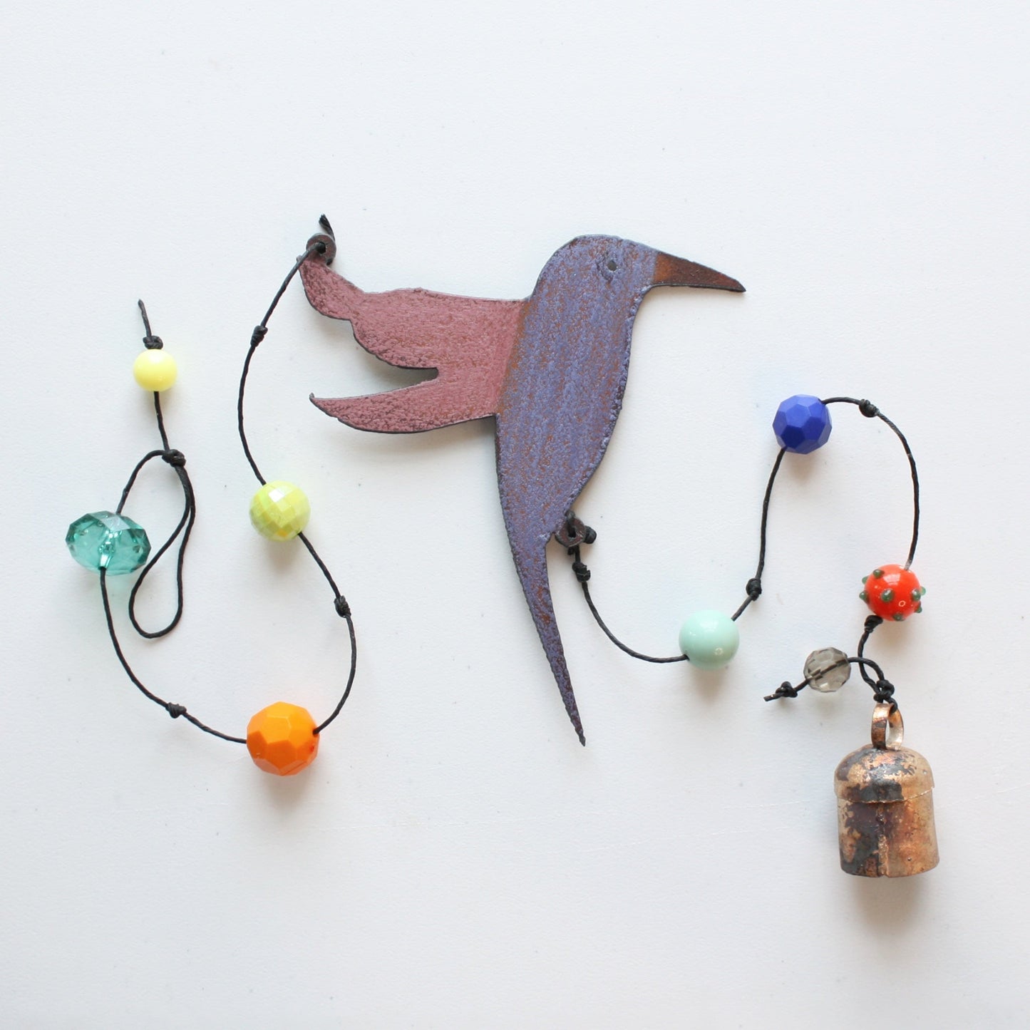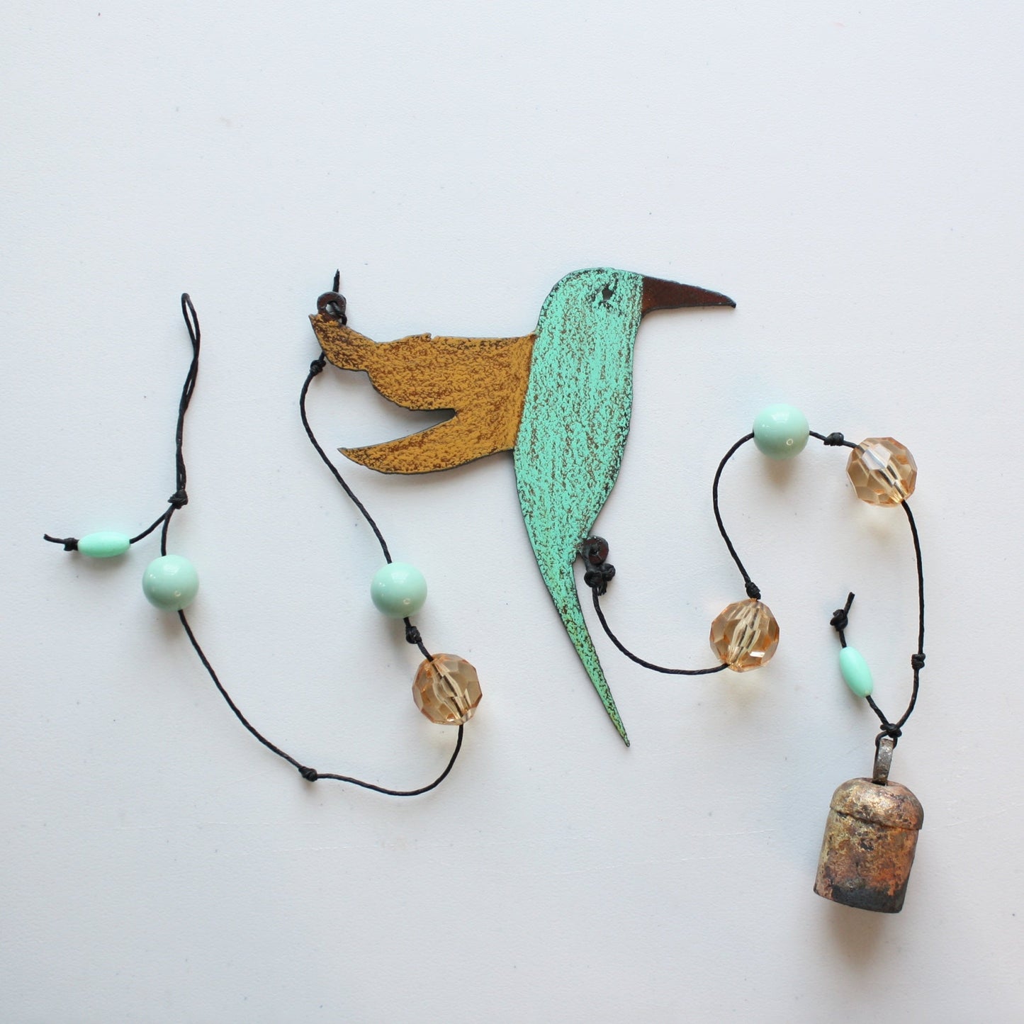 Picture this: a delicate metal hummingbird dancing in the breeze, adorned with an array of colorful beads and a bell that tinkles like tiny whispers of music. Each chime is a unique expression of art, bursting with personality and crafted with recycled metals sourced from all over the USA.