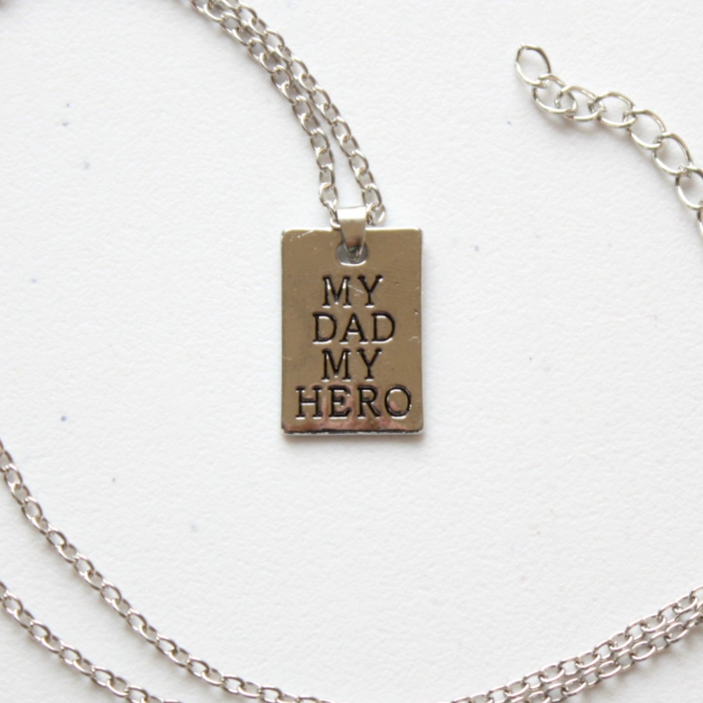 This "My Dad, My Hero" Necklace is the perfect accessory to celebrate the superhero in your life! Handcrafted with love right here in the USA, this necklace is a unique and meaningful way to honor your incredible dad.
