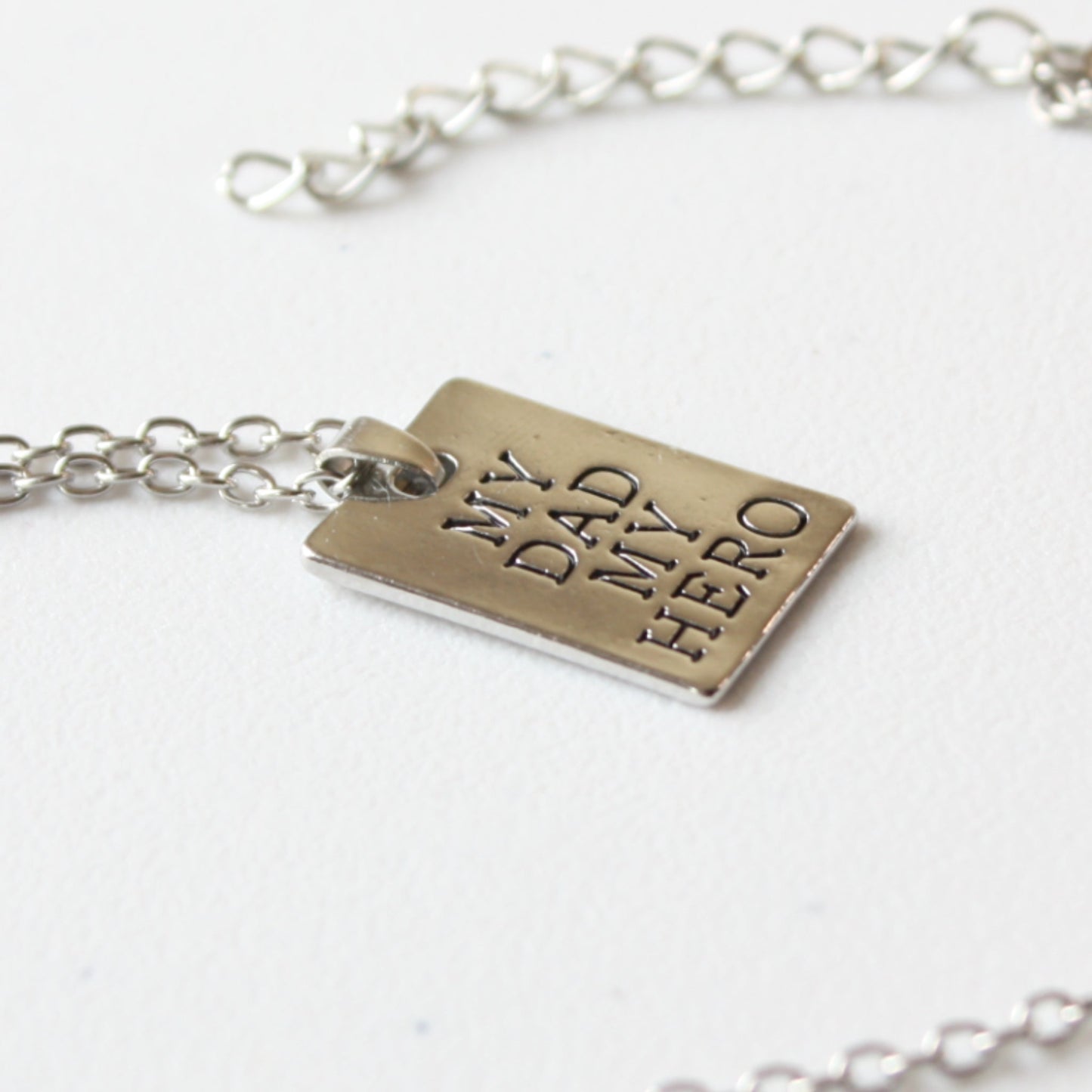 Made with exquisite attention to detail, this charming piece features a pendant that proudly displays the heartwarming message, "My Dad, My Hero." The pendant is carefully hand-stamped, giving it a rustic and personal touch that captures the essence of your special bond.