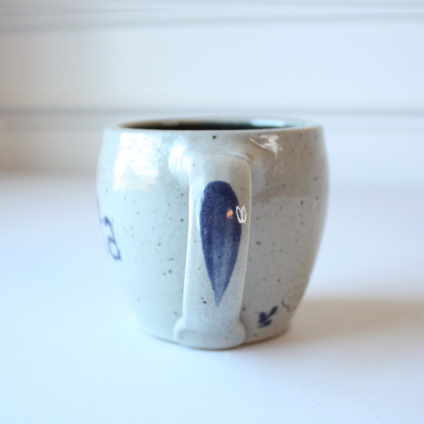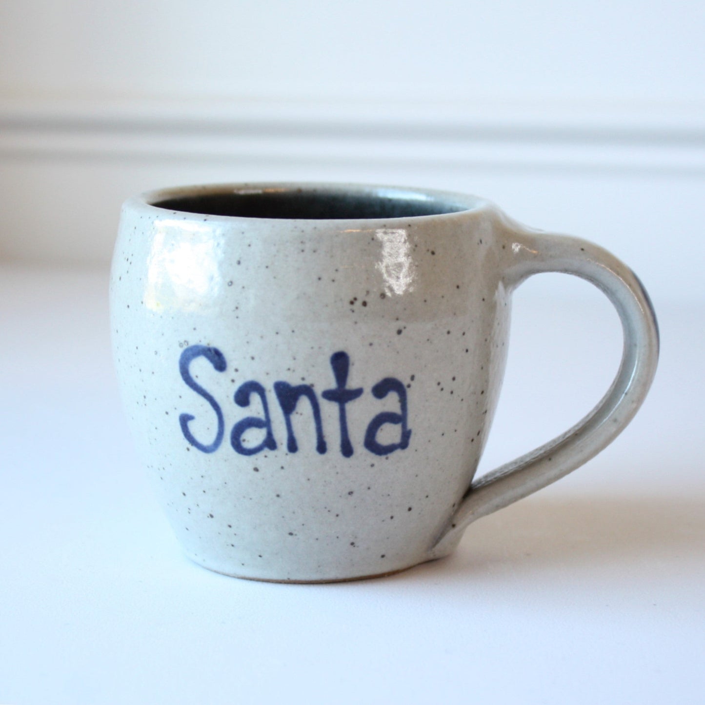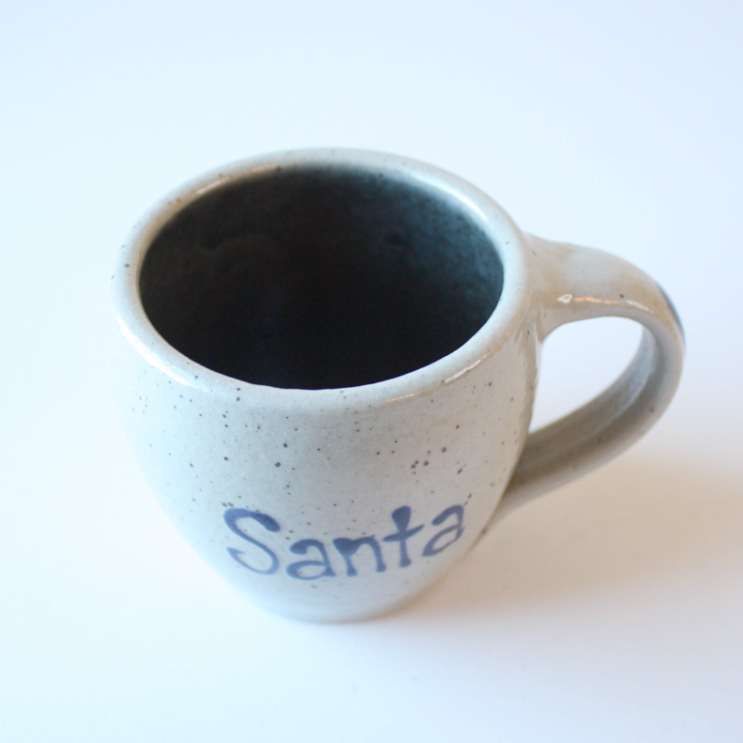 Santa's Pottery Cocoa Mug is handmade by Artisan potters in Cambridge, Wisconsin. This stoneware mug is hand painted with a blue "Santa" script.