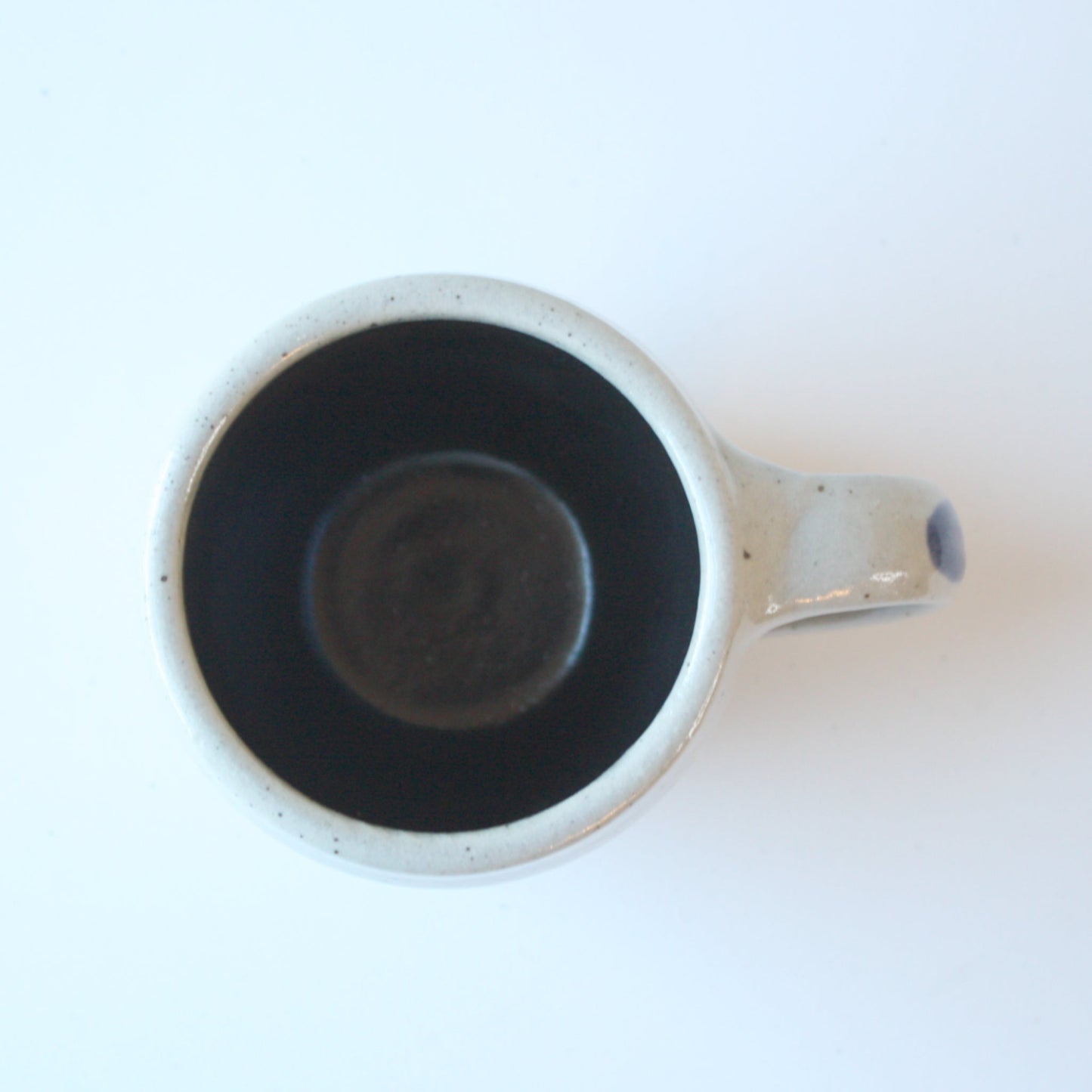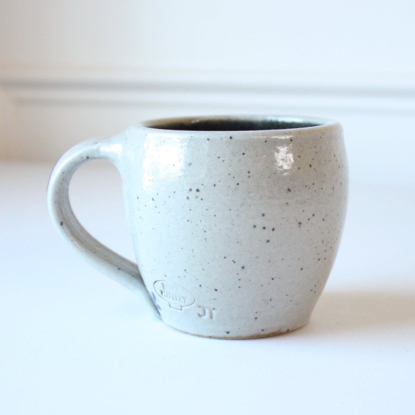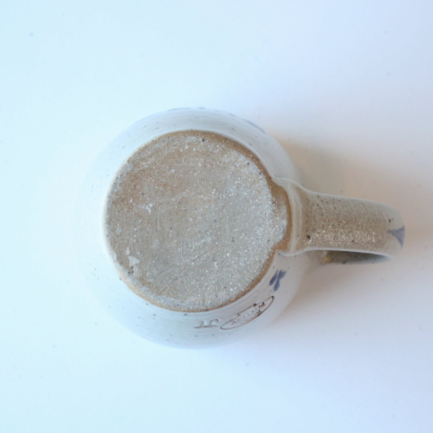 Santa's Pottery Cocoa Mug is handmade by Artisan potters in Cambridge, Wisconsin. This stoneware mug is hand painted with a blue "Santa" script.