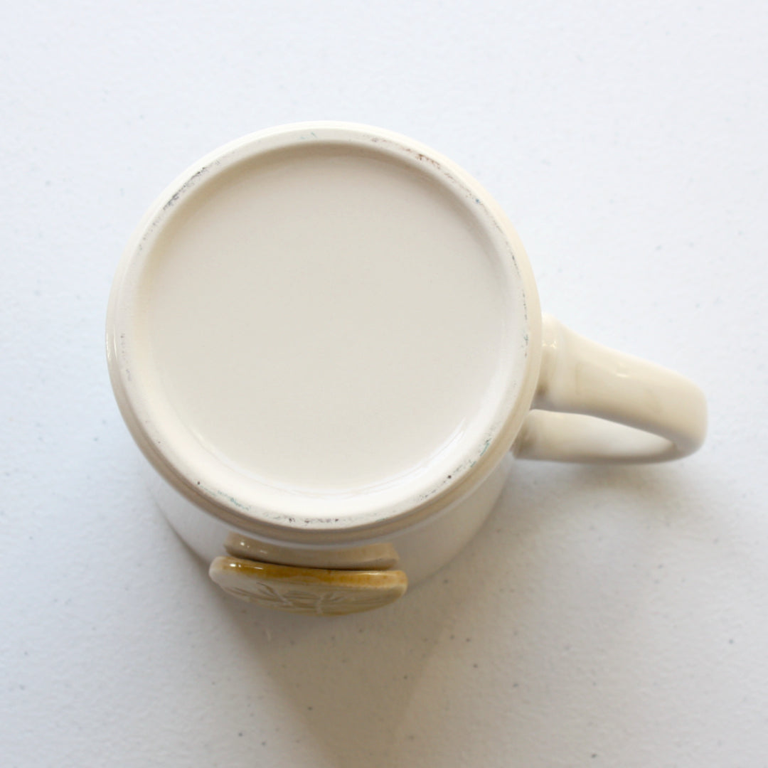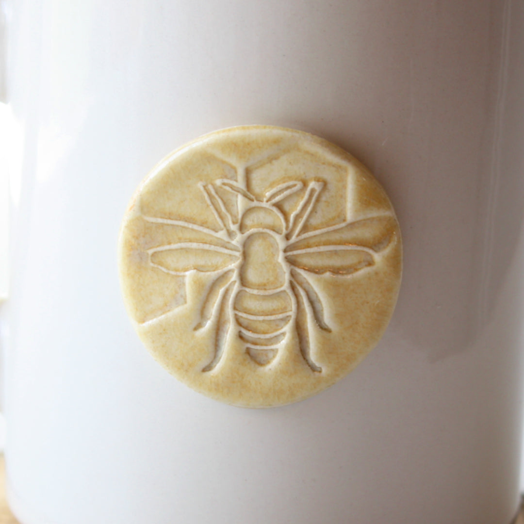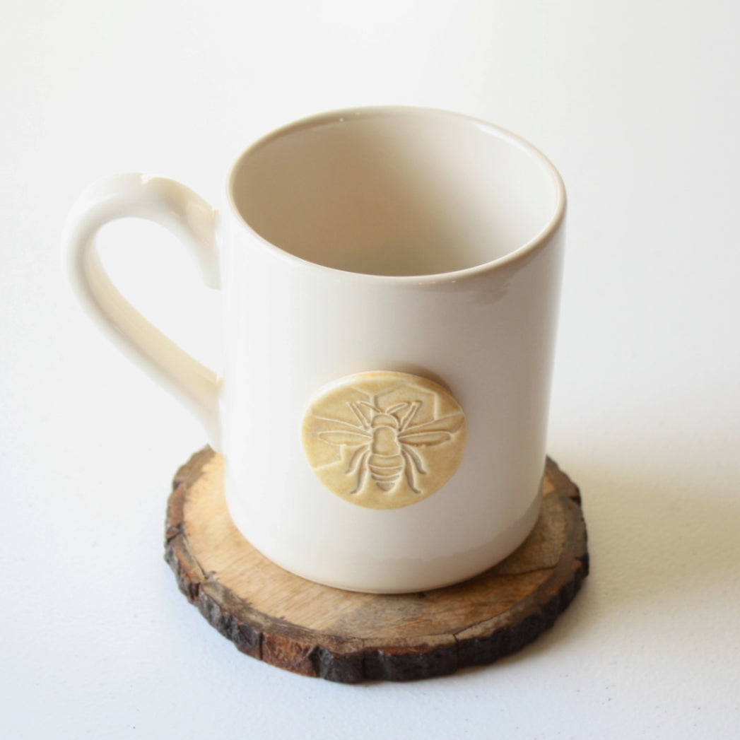 This Stoneware Bee Bug Mug adds some special charm to your morning coffee. The substantial handmade ringed mug is painted in a lovely white glaze with a bee adornment.