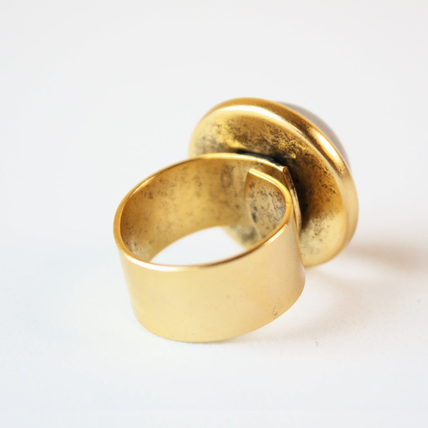 Introducing our "Iridescent" Hand Carved Trochus Shell Ring, a whimsical fusion of elegance and artisanal craftsmanship that's sure to capture hearts and spark conversations wherever you go. Handcrafted by skilled artisans right here in the USA, this exquisite piece features a mesmerizing trochus shell intricately carved and nestled within an antique gold ring setting. Each ring is adjustable between sizes 7 to 9, ensuring a perfect fit for any finger.